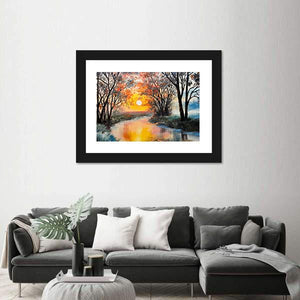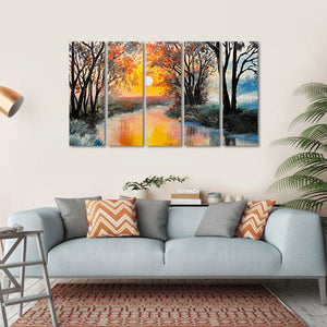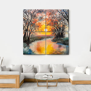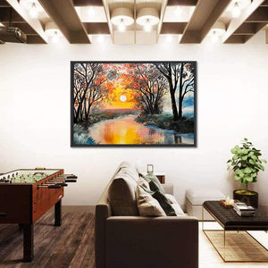 This beautiful canvas art captures a serene landscape with a winding river framed by vibrant trees under a sunset sky. The warm palette of oranges and yellows creates a calm atmosphere, making it an inviting piece for any room.