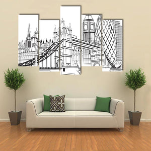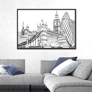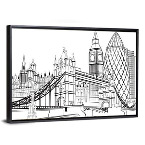 This canvas features a detailed black and white silhouette of London's iconic skyline, showcasing landmarks like Big Ben, Tower Bridge, and The Gherkin. The minimalist line art style evokes an architectural mood that resonates with lovers of modern design.