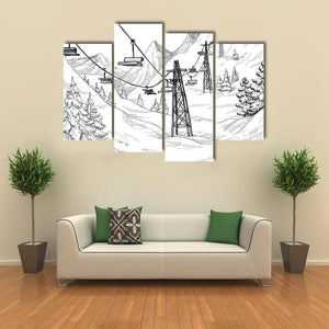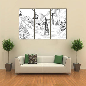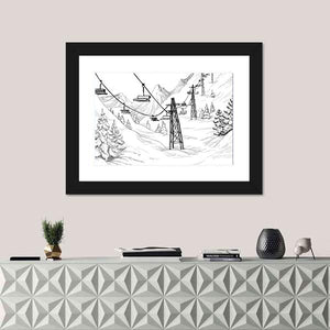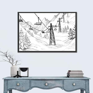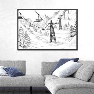 This canvas art features a serene winter scene with a ski lift gliding above a snowy slope framed by majestic mountains and pine trees. The sketchy linework and vintage style evoke a sense of tranquility, making it a beautiful addition to your home.