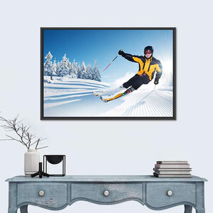 Skier In Mountains captures a lone skier cutting across a groomed ski slope beneath snowy peaks, shown in a photo-realistic style with sun flare and a dynamic angle. The bright blue, white and yellow palette and active, exhilarating mood suit modern homes or sports-themed rooms.