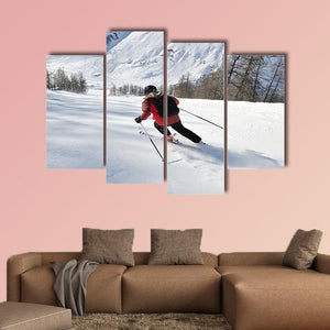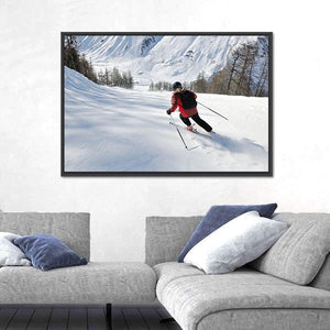 A realistic skiing scene shows a skier in a red jacket racing downhill through snowy mountains and pine trees. White, blue, red and brown tones, plus clear depth and framing, give an active, adventurous yet serene, cold atmosphere that works well with modern home decor.