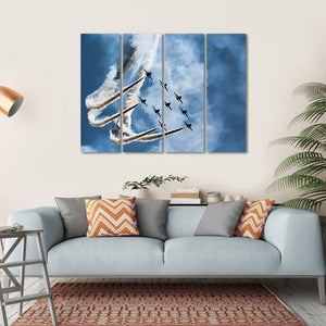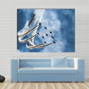 This canvas artwork features a stunning display of ten airplanes in a dynamic triangle formation, surrounded by striking smoke trails. The bold palette of blue, white, and black captures the essence of aerial power, making it a compelling piece for any aviation enthusiast.
