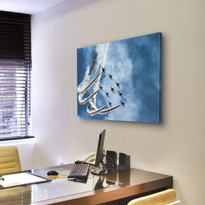 This dynamic canvas showcases nine airplanes in a striking V formation, leaving thick white smoke trails against a blue sky. Its modern photorealistic style adds excitement to your decor.