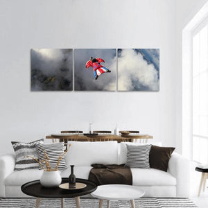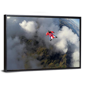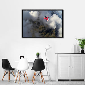 A high-angle action photograph of a person in a red and blue wingsuit cutting through clouds above rugged mountains. The image conveys a thrilling, adventurous, and free atmosphere with strong sense of motion and depth. Suited to modern room decor, it complements contemporary living spaces or a sports-inspired office.