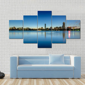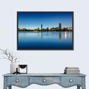 This stunning canvas art showcases the Boston Back Bay skyline at dusk, featuring illuminated buildings and serene water reflections. With its calming palette of blues, oranges, and yellows, this piece is ideal for adding a touch of urban elegance to your space.