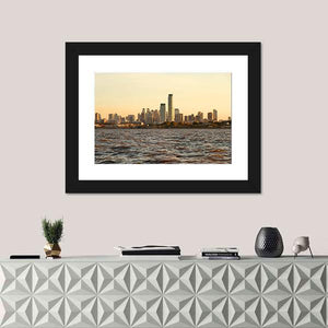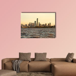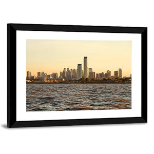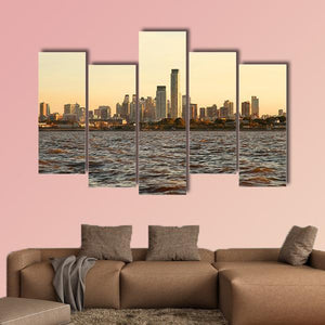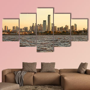 A photographic cityscape of the Buenos Aires skyline at sunset, showing tall buildings and rippling water. Blue, gold, and brown tones follow a rule-of-thirds composition for a calm, serene atmosphere. A modern, understated choice for room decor in living rooms or offices.