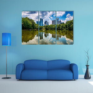 This beautiful canvas art captures the serene skyline of downtown Atlanta, featuring tall buildings reflected in a tranquil lake. With lush green trees and fluffy white clouds set against a bright blue sky, this piece brings a peaceful atmosphere to any space.