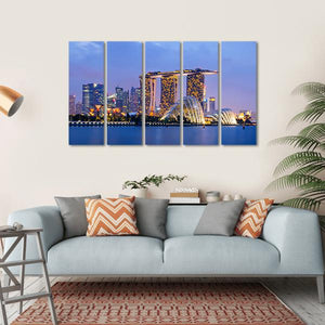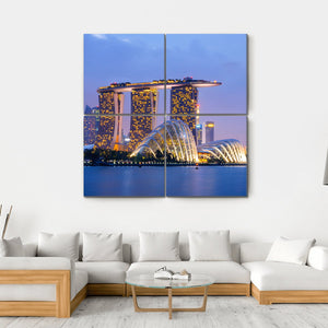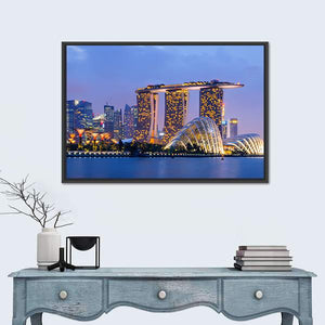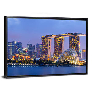 Capture the essence of modern architecture with this stunning canvas that features Singapore's iconic skyline. The illuminated waterfront and intricate lighting of the domed structures create a vibrant and urban atmosphere, perfect for contemporary spaces.