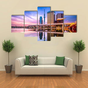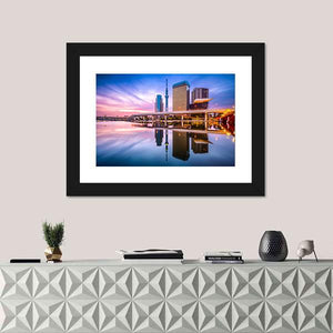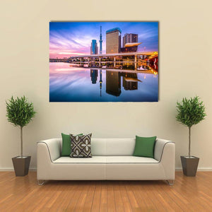 This canvas wall art captures the serene beauty of the city skyline at dawn, featuring a stunning blend of blue, pink, and orange hues. It's an ideal addition for modern spaces, bringing vibrant urban vibes to your decor.