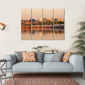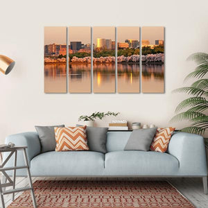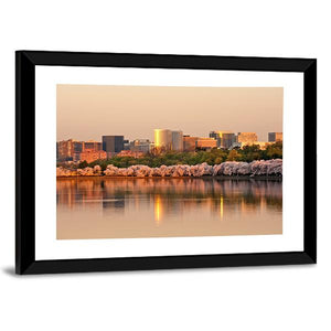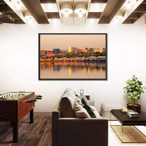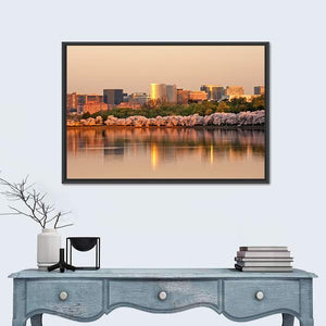 This canvas wall art captures the serene beauty of the Rosslyn city skyline, framed by cherry blossoms in bloom and calm waterfront reflections. The vibrant palette of pinks and blues evokes a tranquil atmosphere, making it a lovely addition to any room decor.