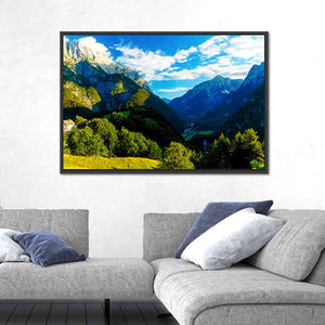 A realistic landscape of Slovenia featuring sunlit mountain peaks, a green valley, dense trees and a small house nestled in a clearing. The composition uses depth and perspective to create a serene, majestic, and peaceful mood in soft greens, blues, whites and warm browns. Suits modern or nature-inspired rooms as a calm focal piece.