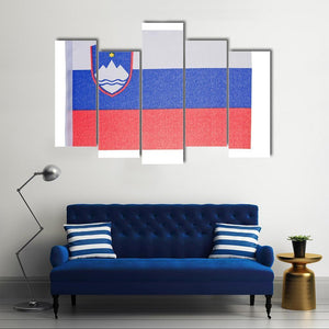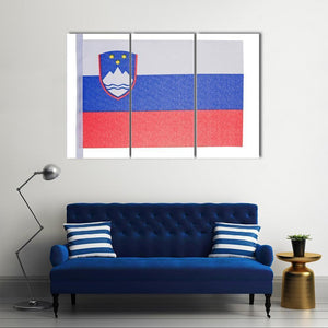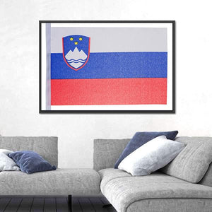 A minimalist canvas print of the Slovenian national flag, created to convey a patriotic, official mood. The rule-of-thirds composition highlights the three horizontal stripes—white, blue and red—with the coat of arms on the upper hoist side featuring mountains and stars. Its restrained, modern look works well in minimalist or modern room decor for the home.