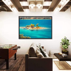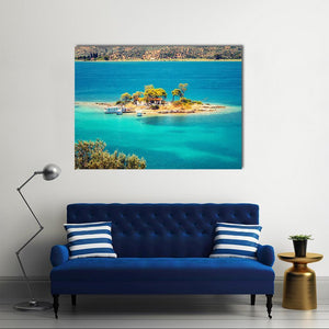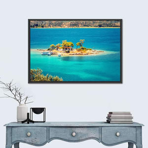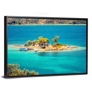 This canvas artwork captures a serene Aegean scene with a tranquil island nestled amidst deep blue waters. Featuring several boats, green trees, and a small building, it brings a sunny, realistic touch of nature to your space.