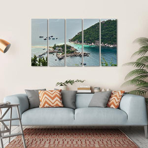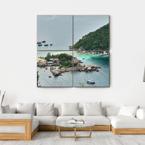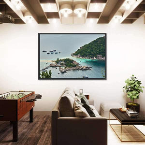 This canvas art captures the serene beauty of a tropical island near Ko Tao, featuring lush green foliage and peaceful blue waters. The high-angle perspective showcases numerous small boats anchored offshore, creating an idyllic vacation vibe for your space.
