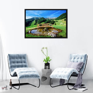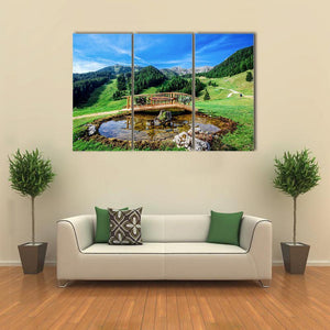 Park In Italy shows an alpine meadow beside a pond with a wooden bridge labeled "Alpe di Luna," set against distant mountains and forest. The peaceful, idyllic scene uses greens, blues, browns, and white to create depth and calm, and it fits nature-inspired or rustic interiors.
