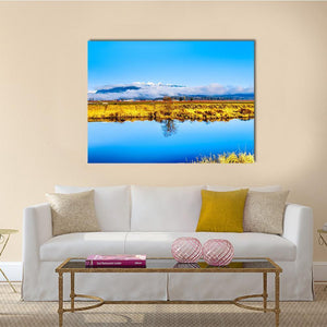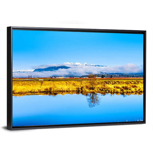 This serene landscape features the Alouette River, surrounded by snow-capped mountains and golden fields. The calm water reflects a bright blue sky, creating a peaceful atmosphere that complements nature-themed décor.