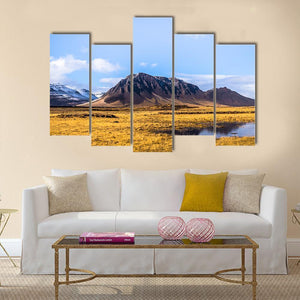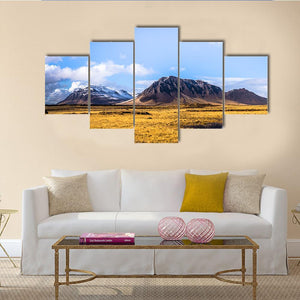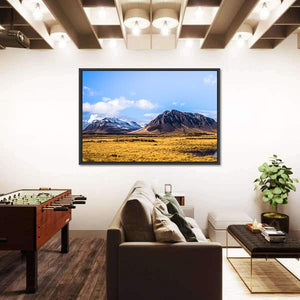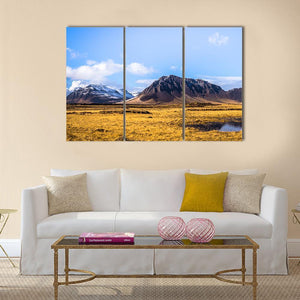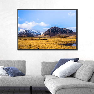 A photographic landscape of Snaefellsjoekull National Park in Iceland, showing snow-capped mountains, a golden grass field and a calm water reflection under a wide sky. The scene reads serene and vast, bringing a natural, quiet presence that suits modern living rooms or nature-themed rooms.
