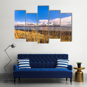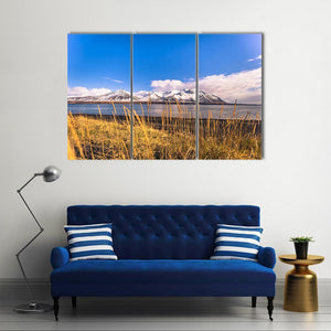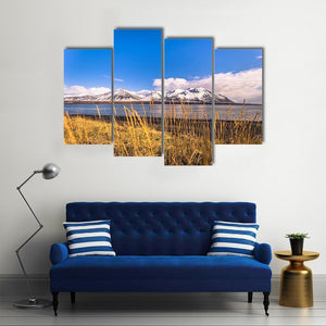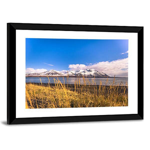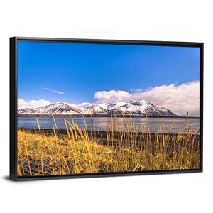 Snaefellsjoekull National Park Canvas Wall Art captures snow-capped mountains, calm water and tall dry grass in a bright, natural scene. Rendered in realistic, vibrant blues, whites, yellows and greens, it creates a serene atmosphere that fits modern room decor and living spaces.