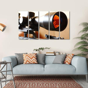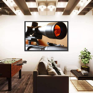 This striking canvas features a detailed close-up of a sniper rifle scope, capturing its technical essence. The photorealistic artwork showcases a palette of black, orange, gray, and brown, offering a powerful visual impact that complements modern decor.