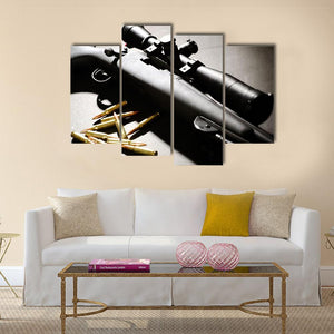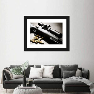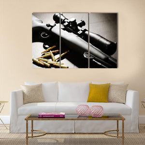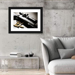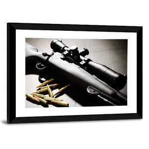 This powerful canvas art features a close-up of a sniper rifle with bullets, showcasing an intense and focused mood. The photorealistic style and dramatic composition highlight the intricate details, including the scope and brass bullet casings.