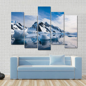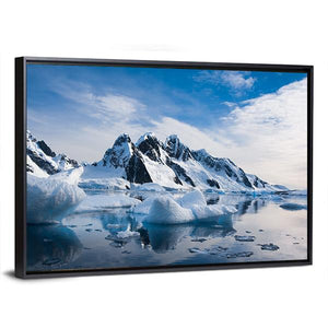 This canvas wall art captures the serene beauty of snow-capped mountains under a blue sky. With its majestic peaks and dramatic clouds reflecting in the water, it evokes a cold, vast atmosphere that enhances any landscape-oriented décor.