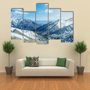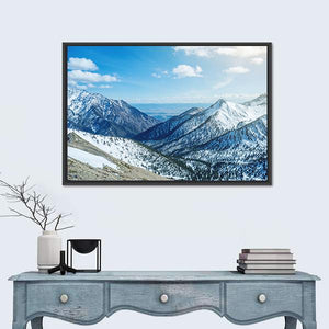 Snow Capped Peaks Of Rocky Mountains depicts layered, snow-capped mountain ranges and pine trees beneath a clear blue sky, with sunlight glinting off the snow. The scene carries a serene, wintry mood. It suits modern homes and living rooms looking for nature-inspired wall decor.