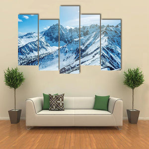Snow Capped Peaks Of Rocky Mountains shows snow-covered mountains, alpine trees, and a wide winter sky in a photorealistic landscape. The scene feels majestic and serene, with sunlight glinting off the snow and a cool blue-white palette with gray and green accents. It suits modern home decor and works well in living rooms, hallways, or offices.