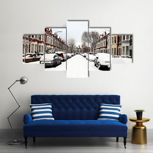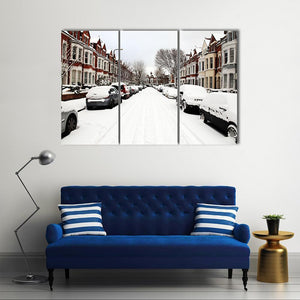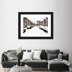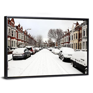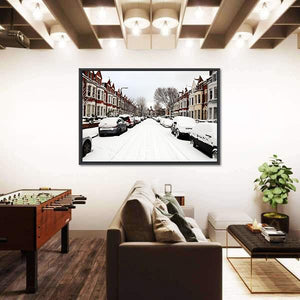 This canvas wall art captures a serene snowy street in London, featuring charming red-brick houses and cars gently covered in snow. The cold, quiet atmosphere invites a moment of calm to any space.