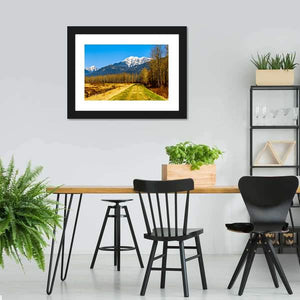 A peaceful, realistic landscape of snow-capped peaks and forested foreground, Snow Covered Golden Ears Mountain shows bare trees, a grassy path and wetland in cool blues, whites, greens and soft yellows. The calm, natural scene works well with modern home decor and room wall art where a serene, nature-focused piece is wanted.