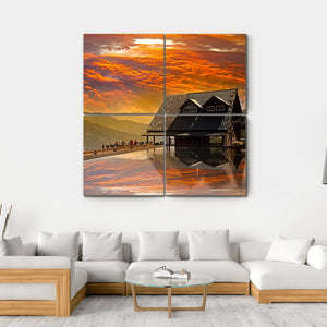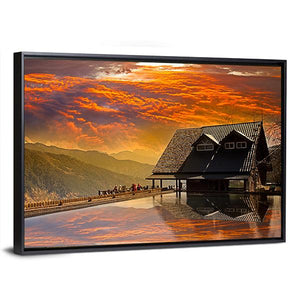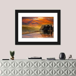 This canvas art captures the serene beauty of Taichung, Taiwan, showcasing a house built over water against a backdrop of majestic mountains. The painting's warm palette of oranges and yellows blends with tranquil blues and browns, reflecting a breathtaking sunset sky and inviting viewers to feel a sense of peace.