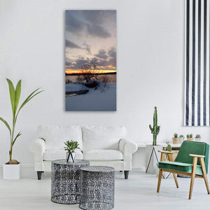 A quiet winter scene of snow near a lake at sunset, with bare branches against an overcast sky touched by soft orange light. Muted blues, grays and white create a calm, serene mood that fits well in modern or nature-inspired rooms.