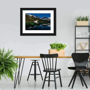 Experience the tranquility of Snow On Emerald Lake, depicting snow-capped mountains and a serene blue sky. This peaceful scene features a calm lake reflecting the beauty of a dense evergreen forest, bringing a sense of nature's stillness to your space.