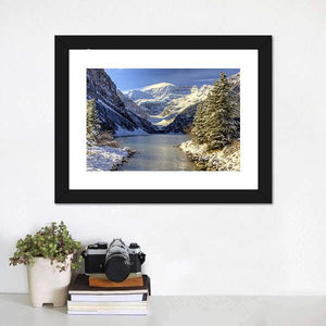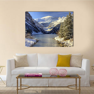 This canvas features a stunning view of Lake Louise, surrounded by majestic mountains and evergreen trees blanketed in snow. The serene, tranquil atmosphere invites calm into any space, making it a perfect addition to your décor.