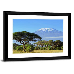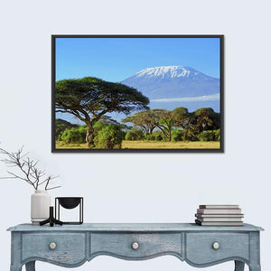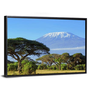 This canvas captures the serene beauty of Mount Kilimanjaro with its impressive snow-capped peak set against a clear blue sky. The composition highlights distinctive acacia trees on the savanna, adding a natural and grand touch to your wall decor.