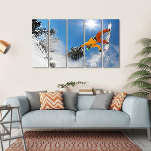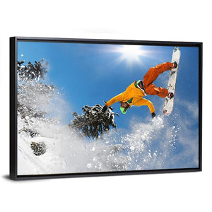 Capture the thrill of winter sports with this dynamic canvas art featuring a snowboarder in mid-air against a bright blue sky. The energetic scene is enhanced by the vibrant colors and the playful snow spray, making it a striking addition to any wall.