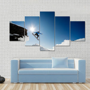 A stunning choice for wall decoration and home decorations, this Painting features single or multiple panels displaying beautiful snowboarder jumping through air after rock drop. Perfect for snowboarders.