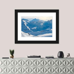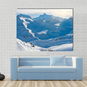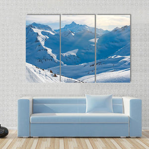 This canvas wall art features serene snowy mountains enveloped in clouds, illuminated by soft sunbeams. The realistic style and majestic mood create a peaceful atmosphere, making it a beautiful addition to any nature-inspired décor.