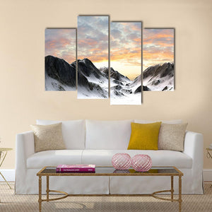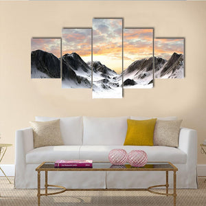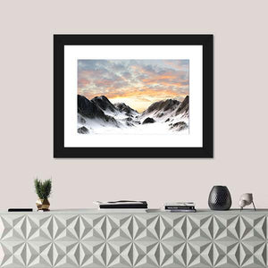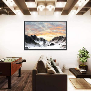Snow-covered peaks and a dramatic sunset sky set the scene in this realistic mountain landscape, with rocky outcrops falling into a broad mountain valley. The image reads as both epic and serene, rendered in white, gray, blue, orange, and pink. It works well as nature-focused wall decor for modern homes and living rooms.