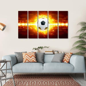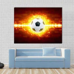 This striking canvas features a black and white soccer ball surrounded by vibrant flames and glowing light streaks. The intense colors of orange, red, and yellow create a dynamic and energetic atmosphere, making it a great addition to any sports-themed décor.