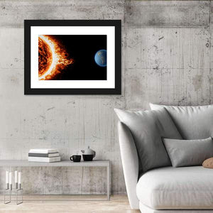 This canvas art depicts a cosmic scene featuring a flaming sun and a detailed Earth. With its vast and awe-inspiring vibe, it’s a captivating piece that enhances any decor.