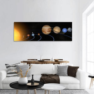 Solar System Planets Panoramic Canvas depicts the sun, orbits, and several distinct planets rendered in an illustrative, modern style. Warm yellows and oranges sit beside deep blues and black to create a cosmic, educational, and vast atmosphere. Works well in modern living rooms, home offices, or classrooms with science-inspired decor.