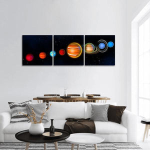 Solar System Planets Panoramic Canvas shows stylized planets with rings and a starry background in a vibrant blue, orange, red, yellow and black palette. Its modern, graphic look and educational, cosmic mood work well in modern rooms, classrooms, or study areas that favor colorful space decor.