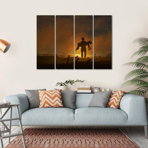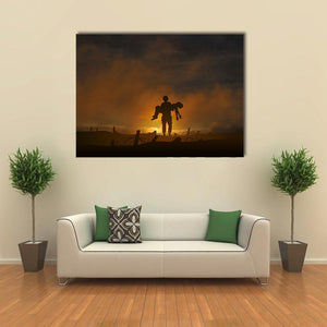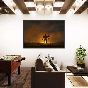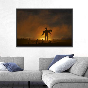 This powerful canvas depicts a soldier carrying a wounded comrade, capturing the somber and dramatic essence of sacrifice on the battlefield. With a cinematic style highlighted by hues of orange, brown, and black, it evokes a mix of hope and melancholy, making it a poignant addition to your wall decor.
