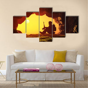 This evocative artwork features the silhouette of a soldier with a backpack and rifle, set against the warm hues of a sunset illuminating a cave opening. The contemplative mood invites reflection and resonates with themes of bravery and solitude.