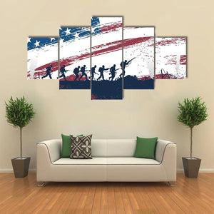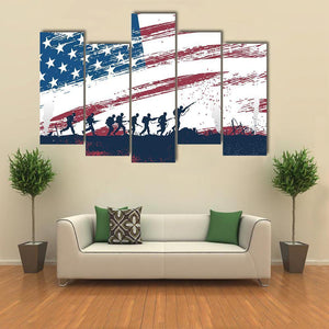 A canvas print showing silhouetted soldiers marching across a distressed American flag. The grunge-modern composition and red, white, blue, and black palette create a patriotic, solemn, and determined atmosphere that suits modern or military-themed room decor.