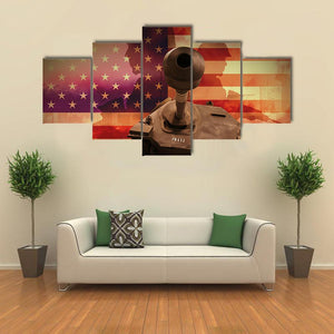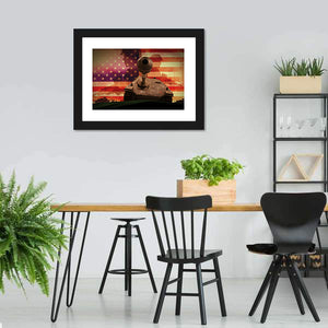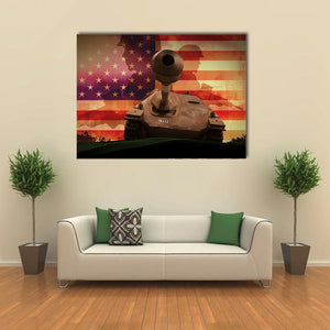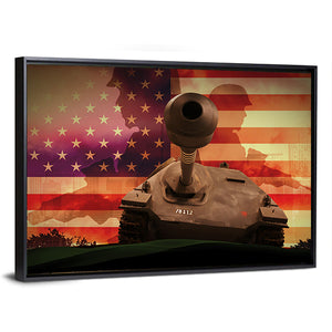 This powerful canvas art features a striking silhouette of a soldier beside a centering tank, against a backdrop of the American flag. The patriotic color palette of red, white, and blue evokes a strong sense of history and valor.