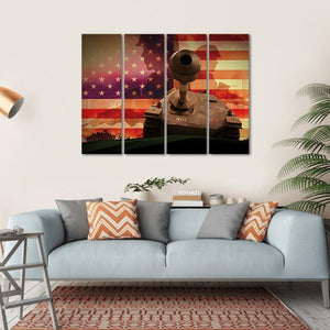 This canvas art depicts a powerful soldier silhouette alongside a tank and the American flag. The use of red, white, and blue evokes a solemn and patriotic atmosphere, making it a meaningful piece for any military-themed decor.