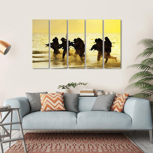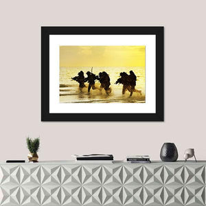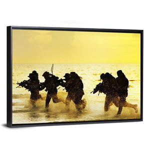This canvas art captures military personnel in action, depicting soldiers skillfully running through water while holding rifles during a dramatic beach landing. The vibrant palette of yellow, brown, and white conveys both intensity and urgency.