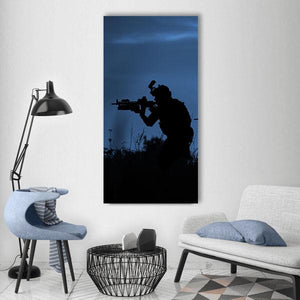 This striking canvas features a silhouette of a soldier kneeling and aiming a rifle against a dark sky. The intense palette of dark blue, black, and gray evokes a dramatic, stealthy atmosphere, making it a fitting choice for military-themed decor.