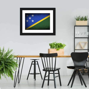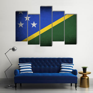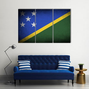 Solomon Islands flag on canvas, composed along a diagonal layout in bold blue, green, yellow and white. The vintage, textured finish and five white stars give this piece a graphic, patriotic feel. Suited to modern room decor or house wall displays.